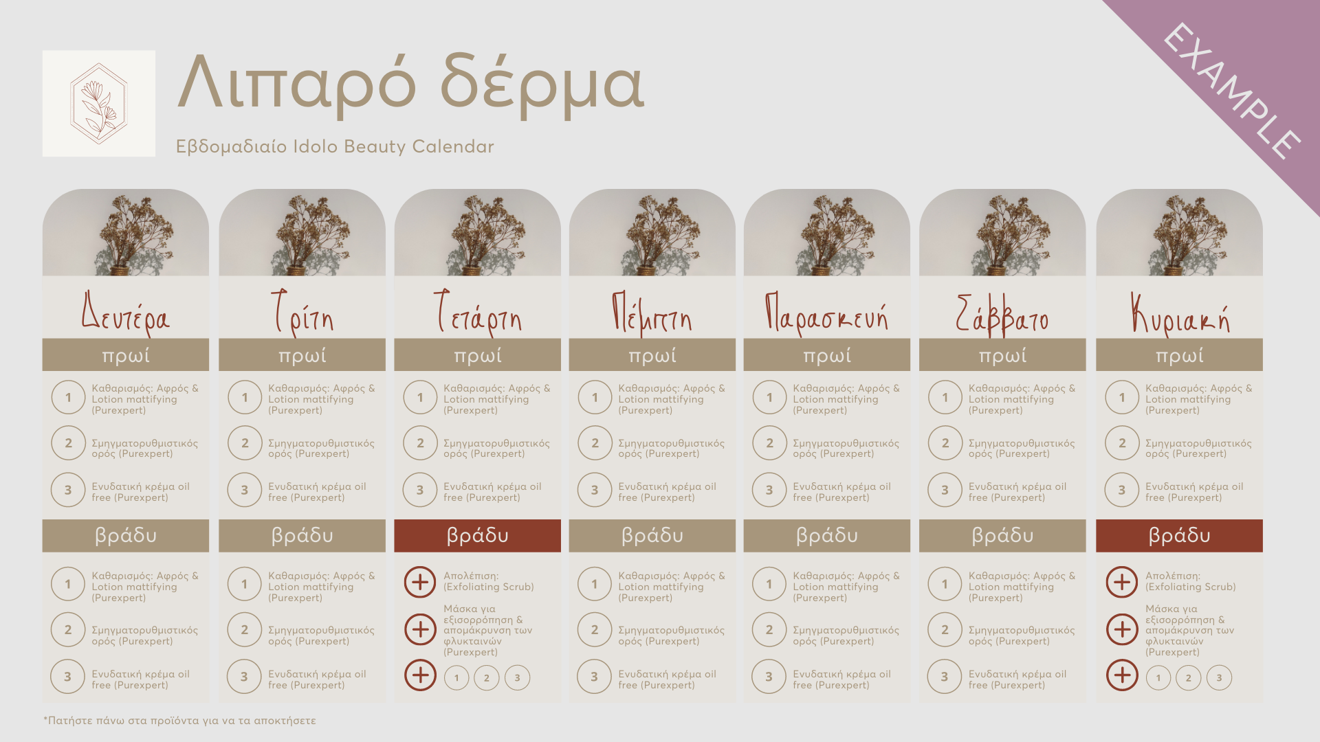 Κατέβασε ΔΩΡΕΑΝ το Idolo Beauty Calendar και ακολούθησε τα βήματα (daily routine) που σου προτείνουμε ανάλογα με τον τύπο της επιδερμίδας σου 👇